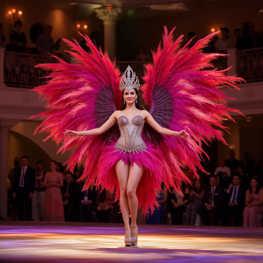 - Candidatas patrocinadas por empresas o colectivos presentan espectaculares fantasías de varios metros de altura, cargadas de plumas, pedrería, luces y estructuras de gran complejidad.