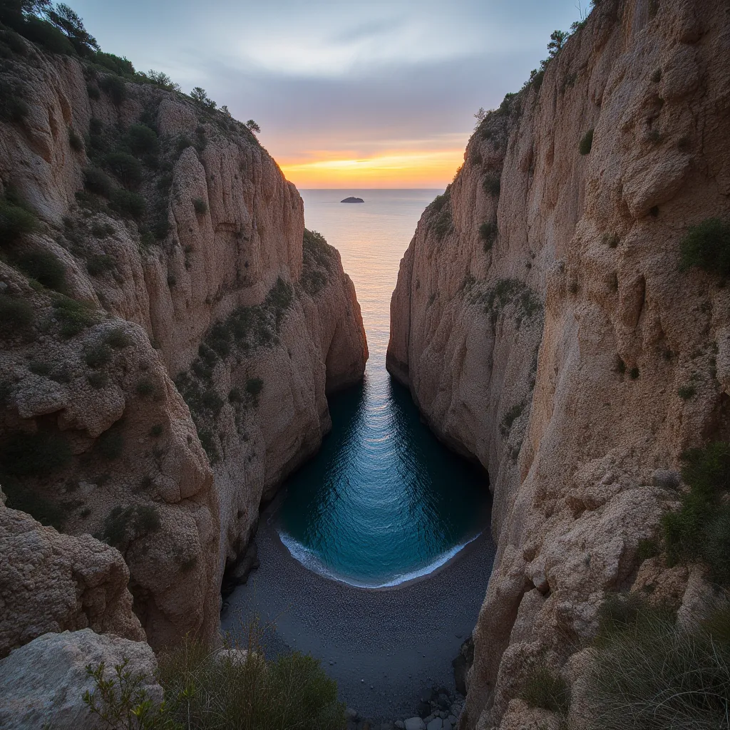 Al llegar al nivel del mar, te recibe una primera cala pequeña, pero el verdadero tesoro se encuentra tras atravesar dos túneles peatonales excavados en la roca viva. Al salir de la oscuridad de los túneles, la luz te golpea y te encuentras en una playa de guijarros (codols) flanqueada por dos paredes verticales de más de 200 metros de altura. La acústica del lugar es tan impresionante que anualmente se celebra aquí un concierto coral.