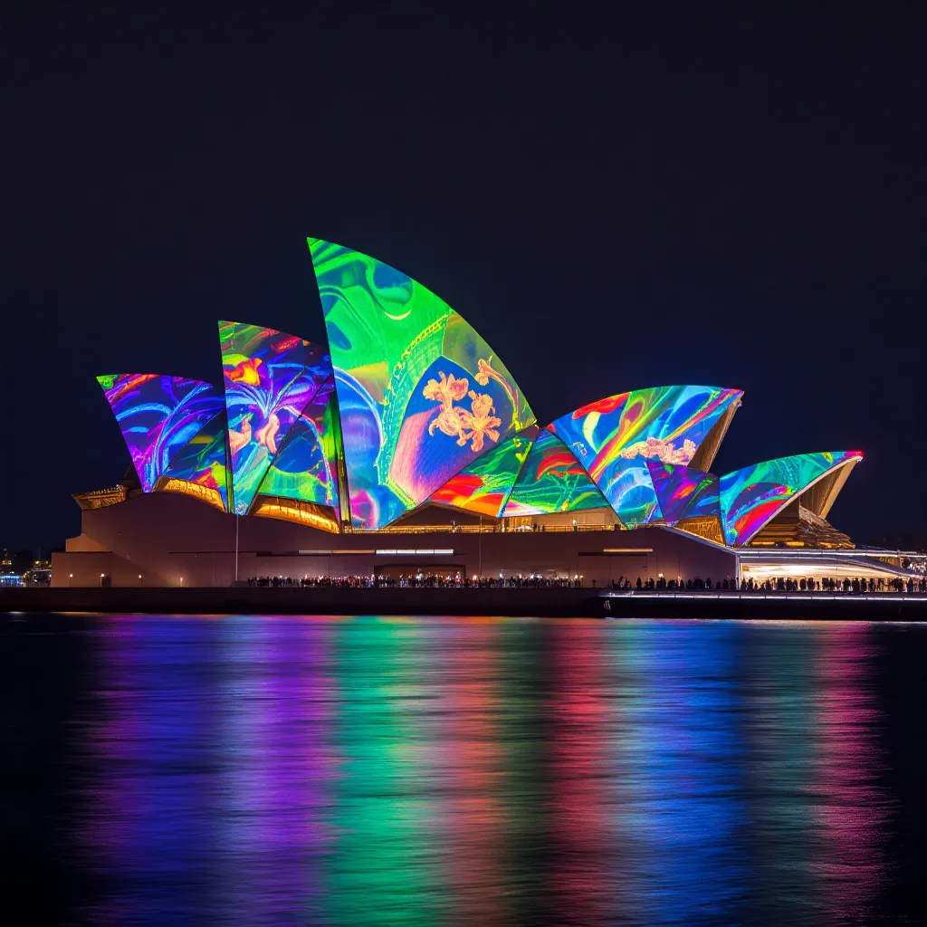 - Noche: el edificio iluminado adquiere un carácter casi teatral; durante festivales como Vivid Sydney se proyectan luces y animaciones sobre las velas, creando un espectáculo único.