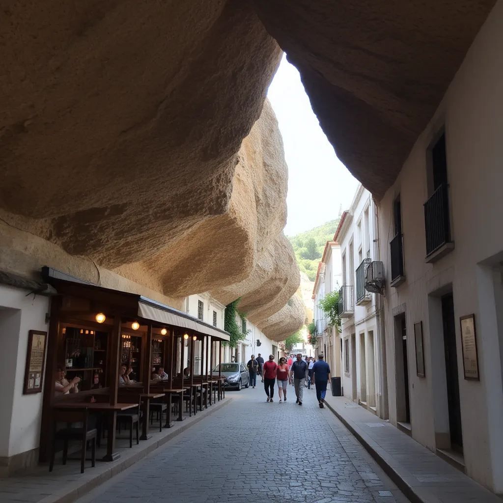 Setenil de las Bodegas es, probablemente, el pueblo más singular de la ruta. A diferencia de otros, no se encarama a un cerro, sino que se incrusta literalmente en el cañón excavado por el río Trejo: muchas casas están construidas bajo enormes salientes de roca.