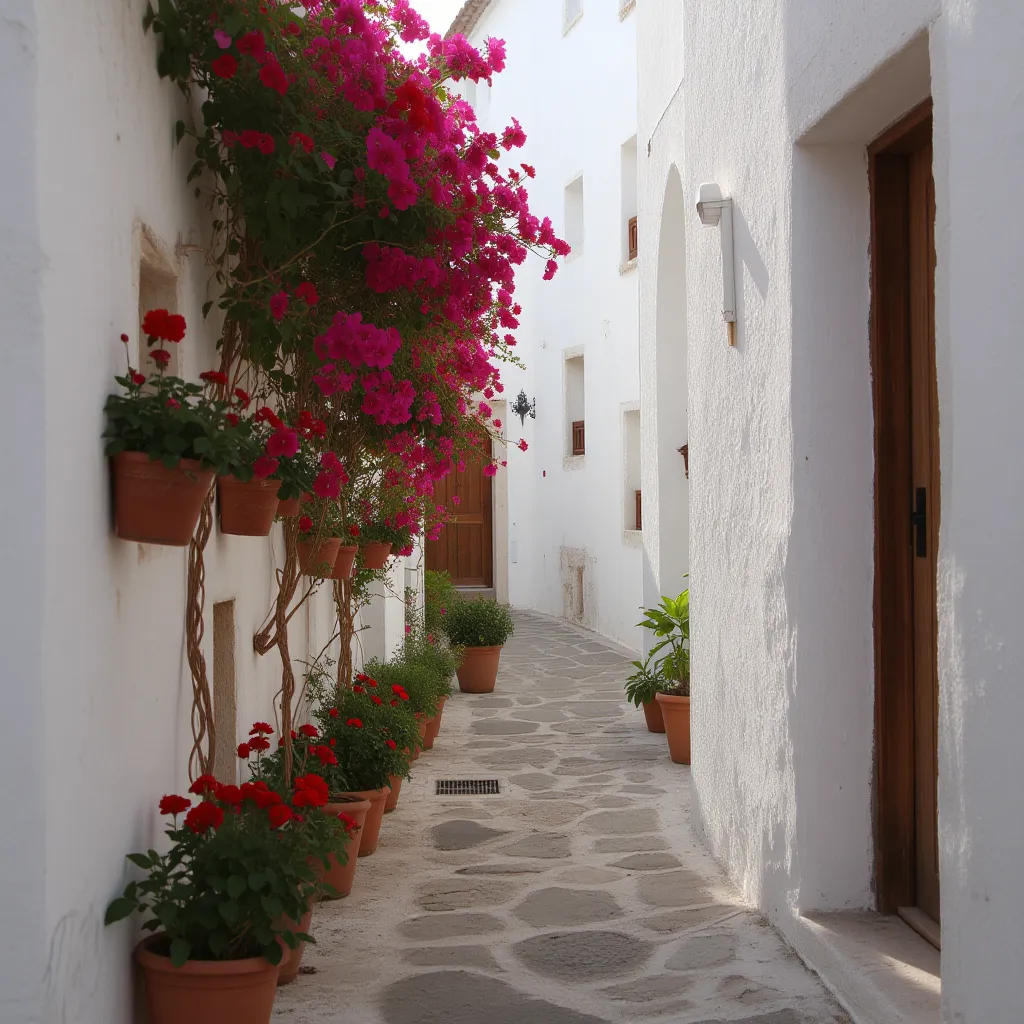 - Casco urbano: casas encaladas con tejados a dos aguas, placitas con fuentes y balcones floridos.