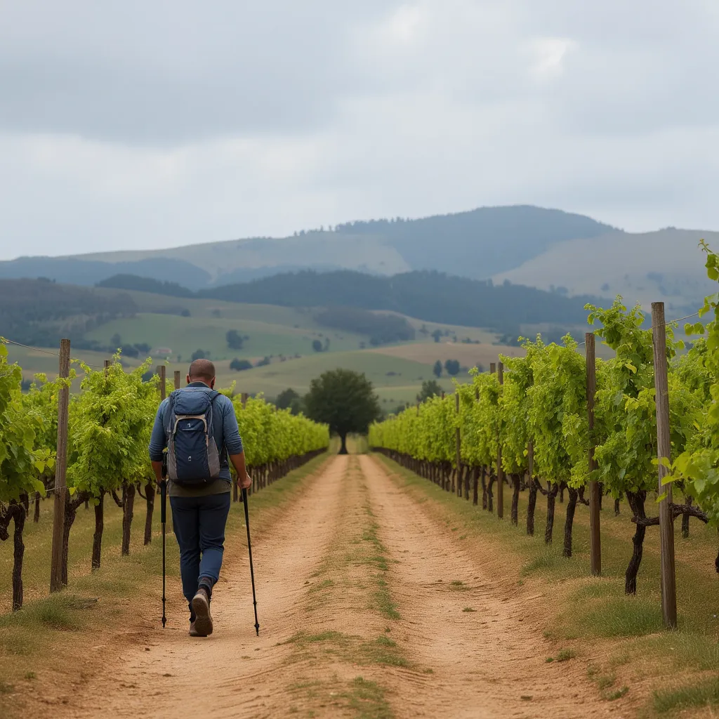 - senderistas que disfrutan caminando entre viñedos,