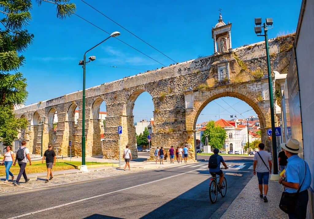 Junto al Jardín Botánico aparece el Aqueduto de São Sebastião, conocido también como Arcos do Jardim. Aunque su configuración actual se asocia a reconstrucciones del siglo XVI, se apoya en la idea de un trazado anterior de origen romano.