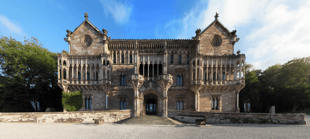 El Palacio de Sobrellano es el símbolo de la opulencia indiana y del historicismo ecléctico. Encargado por el Marqués de Comillas al arquitecto Joan Martorell, este palacio fue el primer edificio de España con luz eléctrica y servía como residencia veraniega para la familia y el séquito real de Alfonso XII. Destaca su fachada neogótica, las galerías con columnas y una imponente sala del trono.